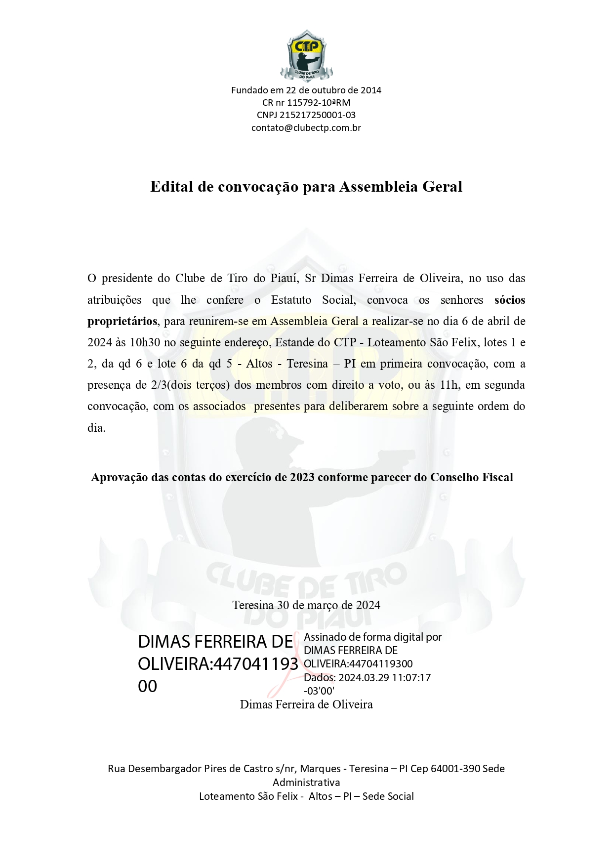 O presidente do Clube de Tiro do Piauí, Sr Dimas Ferreira de Oliveira, no uso das atribuições que lhe confere o Estatuto Social, convoca os senhores sócios proprietários, para reunirem-se em Assembleia Geral a realizar-se no dia 6 de abril de 2024 às 10h30 no seguinte endereço, Estande do CTP – Loteamento São Felix, lotes 1 e 2, da qd 6 e lote 6 da qd 5 – Altos – Teresina – PI em primeira convocação, com a presença de 2/3(dois terços) dos membros com direito a voto, ou às 11h, em segunda convocação, com os associados presentes para deliberarem sobre a seguinte ordem do dia.